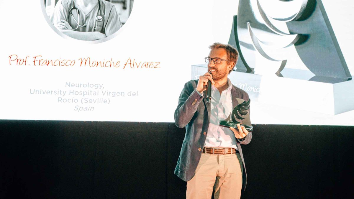 El Dr. Moniche ha sido galardonado por su compromiso con la mejora de la atención de la enfermedad cerebrovascular en España. Lidera un equipo que está desarrollando del sistema QM para ictus, con el objetivo de la mejora de los tiempos de actuación y acceso a tratamientos en fase aguda y la vuelta a la marcha en pacientes con ictus cuando se encuentran en una fase subaguda, esto es, días después de sufrir el accidente cerebrovascular. Todo ello, junto a la rehabilitación interdisciplinar y el control de otros factores relacionados.