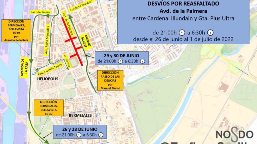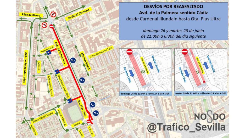La Avenida de la Palmera sufrirá cortes totales al tráfico durante los días 26, 27, 28, 29, 30 de junio y 1 de julio, debido a las obras de pavimentación que se acometerán durante esos días. Los cortes y desvíos de tráfico durarán desde las 21:00 a las 6:30 horas de dichas jornadas. Las obras se iniciarán este domingo para mejorar las condiciones del pavimento del tramo de la Avenida de la Palmera comprendido entre Glorieta Plus Ultra y calle Cardenal Ilundain. Con 330.150 euros de presupuesto total, la intervención, muy demandada, mejorará la circulación y seguridad vial por esta arteria principal de la ciudad, siendo la primera de las fases programadas para la renovación de toda su calzada.