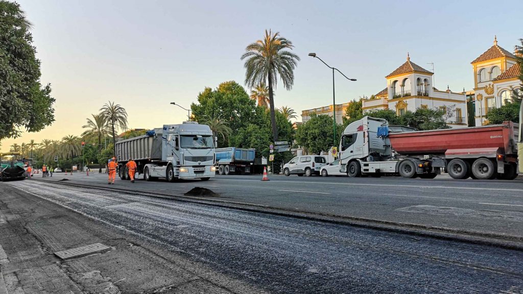 La Gerencia de Urbanismo y Medio Ambiente del Ayuntamiento de Sevilla, en coordinación con el Área Municipal de Movilidad y los distritos Sur y Bellavista-La Palmera, ha iniciado hoy la obra para mejorar las condiciones del pavimento del tramo la Avenida de la Palmera comprendido entre Glorieta Plus Ultra y calle Cardenal Ilundain. Está previsto que esta intervención tenga una duración de seis días, de forma que quedarán terminadas el viernes 1 de julio. La mayor parte de esta intervención se desarrollará en horario nocturno para causar las mínimas afecciones posibles a la circulación, si bien los trabajos previos ya se han iniciado aprovechando la jornada de este domingo, con menor intensidad en la circulación, para realizar labores de fresado, pavimentación y señalización en sentido Cádiz.