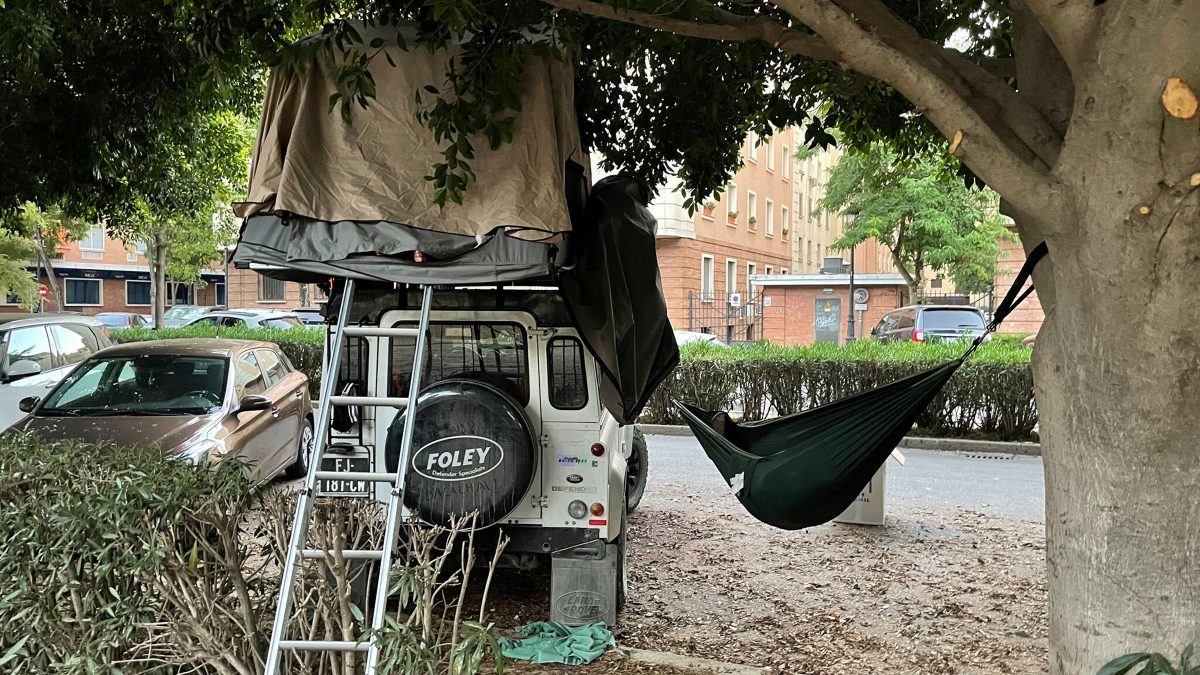 Este lunes, una de las calles del Prado de San Sebastián amaneció con una persona haciendo camping, con hamaca incluida. El hecho lo han presenciado varios viandantes de Sevilla, pues esa zona es una de las más concurridas de la ciudad. En las imágenes que una usuaria ha subido a Twitter se puede observar cómo la tienda de campaña estaba puesta sobre el techo de un coche todoterreno, además de la hamaca sujeta entre dicho vehículo y uno de los árboles.