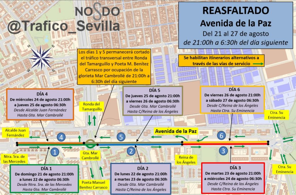 Para que la repercusión en el tráfico rodado en la Avenida de la Paz sea la menor posible, las obras se van a realizar en todo momento en horario nocturno y se acometerán por tramos, actuando de forma escalonada. En concreto, de acuerdo con la delegación de Movilidad, los trabajos arrancarán el próximo domingo a las 21 horas, momento a partir del cual se cortará la circulación hasta las seis de la mañana del lunes 22 en sentido salida de Sevilla a Utrera entre la Glorieta Víctimas del Terrorismo y la Glorieta Mar Cambrollé. Durante este tiempo quedará habilitada una vía de servicio en ese sentido. Igualmente, durante el mismo horario entre la noche del lunes 22 a la mañana del martes 23, y en el mismo sentido de salida, se cortará la circulación al tráfico entre la Glorieta Mar Cambrollé y la intersección con la calle Reina de los Ángeles, abriéndose también en este trayecto una vía de servicio alternativa.