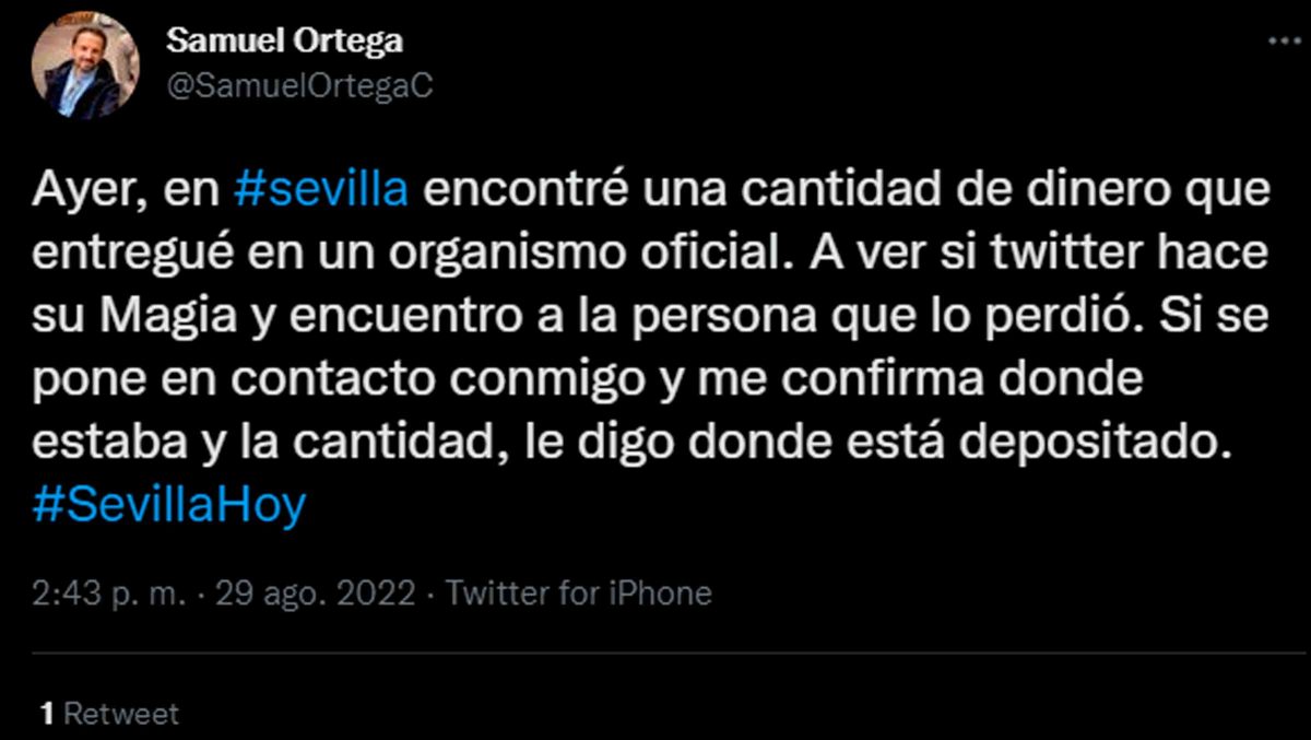 Samuel Ortega, @SamuelOrtegaC en Twitter, ha publicado este lunes en la red social que el pasado domingo se encontró una cantidad de dinero perdido en Sevilla que ha entregado en un organismo oficial para salvaguardarlo. En el mismo tuit, Samuel busca al dueño de ese dinero, una cantidad que debe de ser importante si ha decidido entregarlo y buscar a su dueño.