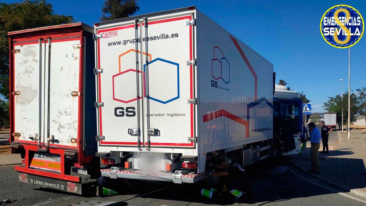 El servicio de Emergencias Sevilla ha intervenido en un accidente de tráfico que ha tenido como protagonistas a dos camiones. Los hechos han ocurrido en el Polígono Industrial El Pino, donde ambos vehículos colisionaron en el cruce entre las calles Encuadernación y Pino Siberia.