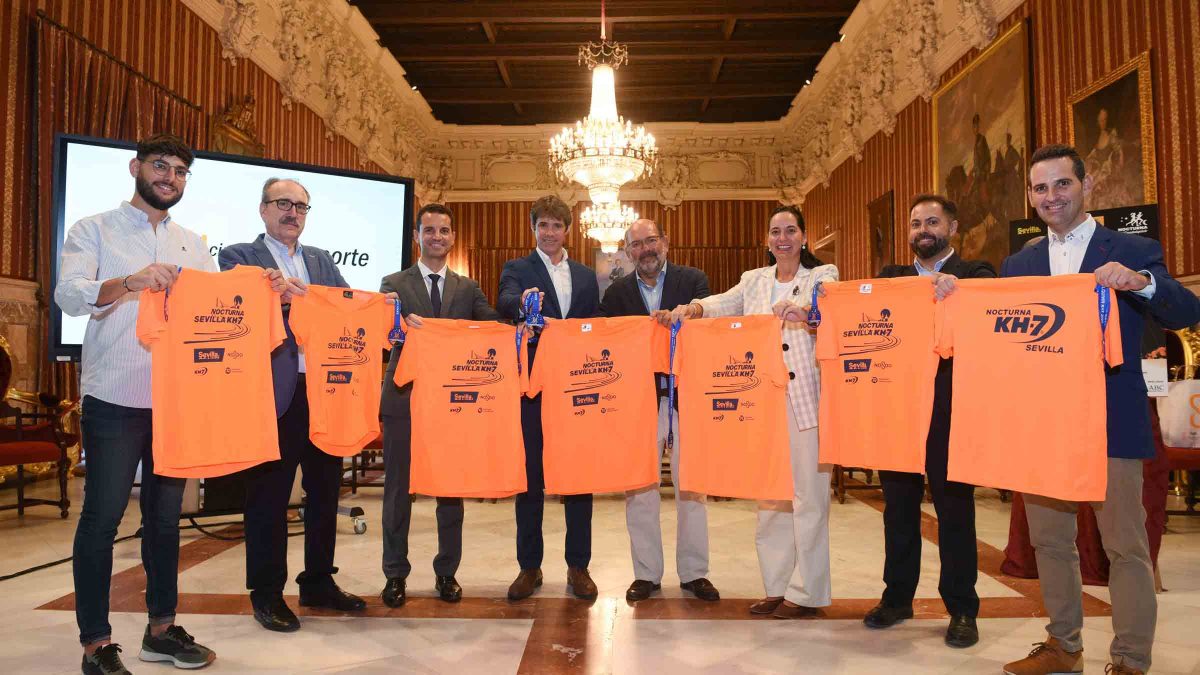 El delegado de Transición Ecológica y Deportes del Ayuntamiento de Sevilla, David Guevara, ha presentado junto a patrocinadores y colaboradores la camiseta y la medalla de la KH-7 Carrera Nocturna del Guadalquivir. Con el protagonismo del propio río y el marco de conjuntos arquitectónicos singulares que enmarcan su recorrido y se encuentran vinculados a su historia, esta imagen mantiene la combinación de tradición y vanguardia en continuación de las identidades visuales municipales actuales.