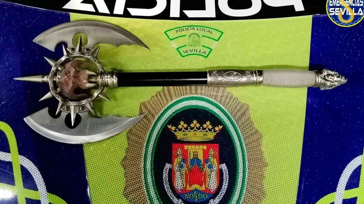 La Policía Local de Sevilla intervino este martes un hacha medieval con dos hojas de 25 centímetros a cada lado a un hombre que circulaba sin carnet con un vehículo de alta gama por el Distrito Cerro Amate.