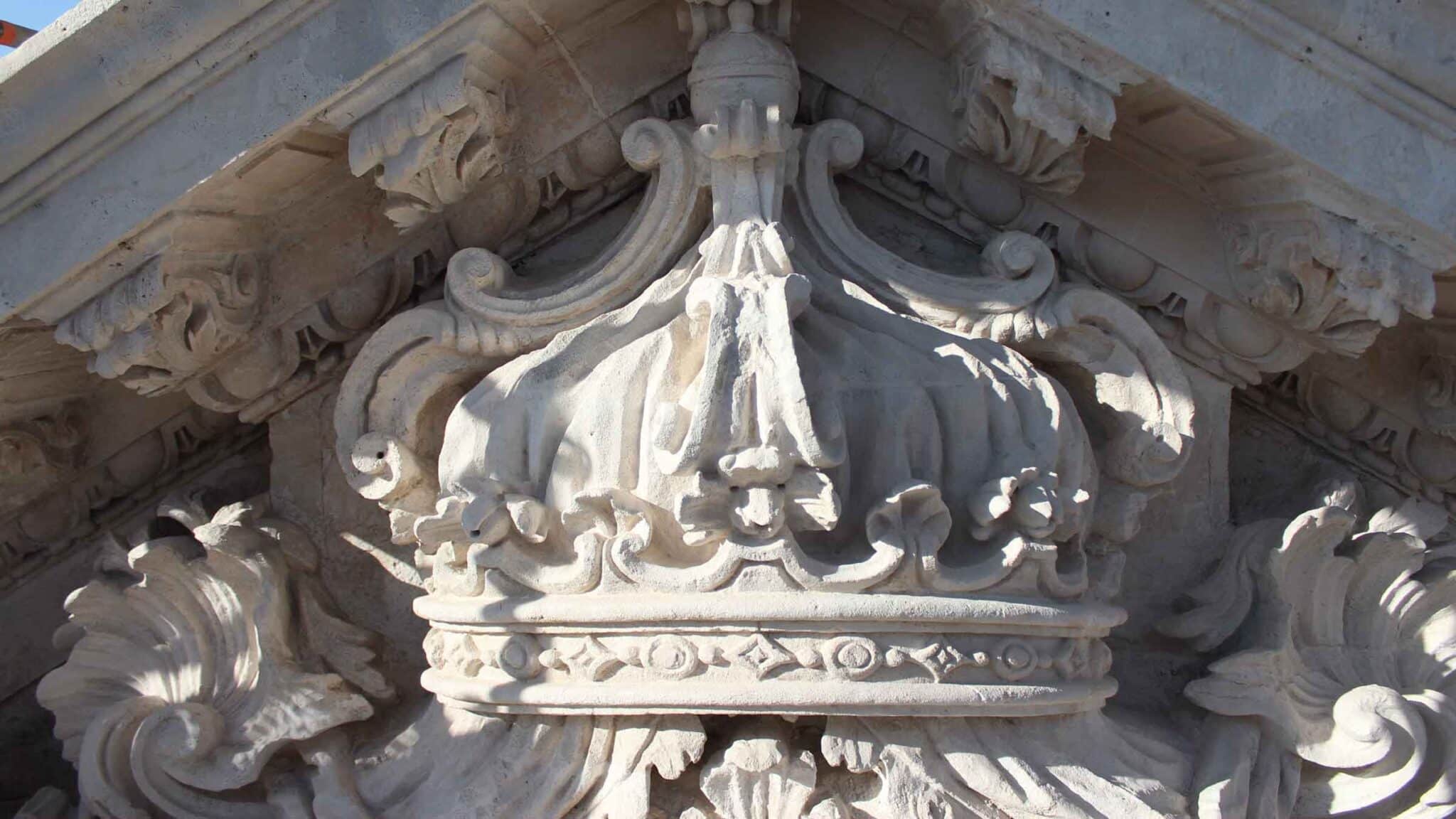 Tanto el escudo como el arco de medio punto de acceso al edificio han sido intervenidos mediante un metódico trabajo artesanal de limpieza, reintegración de lagunas que pudieran ocasionar acumulación de agua, y estabilización, consolidación y protección de la piedra.