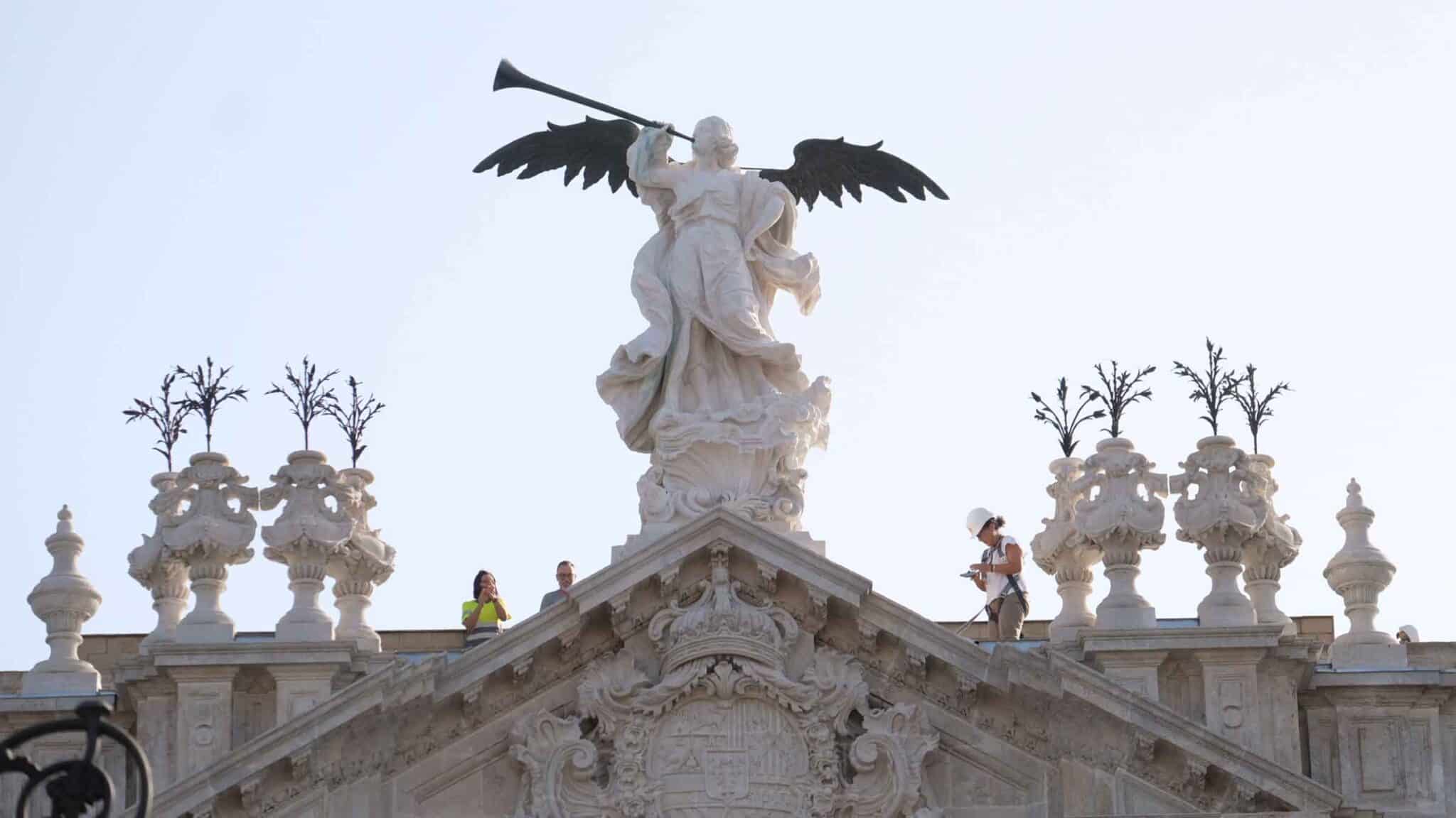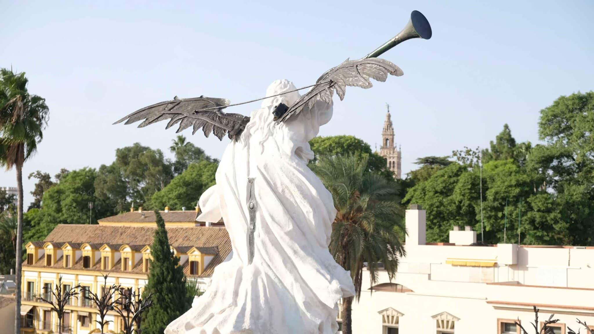 Por su parte, la trompeta está compuesta de latón (aleación de cobre y bronce), que al estar en contacto con el anillo de hierro ha producido manchas de tinte verdoso en el brazo de la figura. Por este motivo, los expertos han tomado la decisión de sustituir la parte más deteriorada de la trompeta por una réplica de iguales características, pero con un aro de refuerzo de latón en lugar del original en hierro evitando así la futura corrosión. Los jarrones, pináculos y azucenas que enmarcan la escultura también han sido objeto de la restauración.