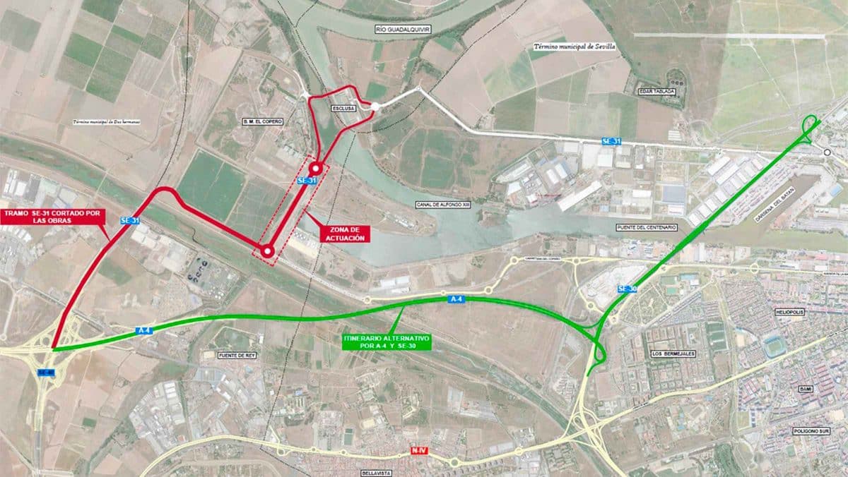 • El tráfico procedente de la SE-40, SE-30 y A-4 que quiera acceder a la SE-31, será desviado por el itinerario alternativo empleando para ello la carretera A-4 y la SE-30.