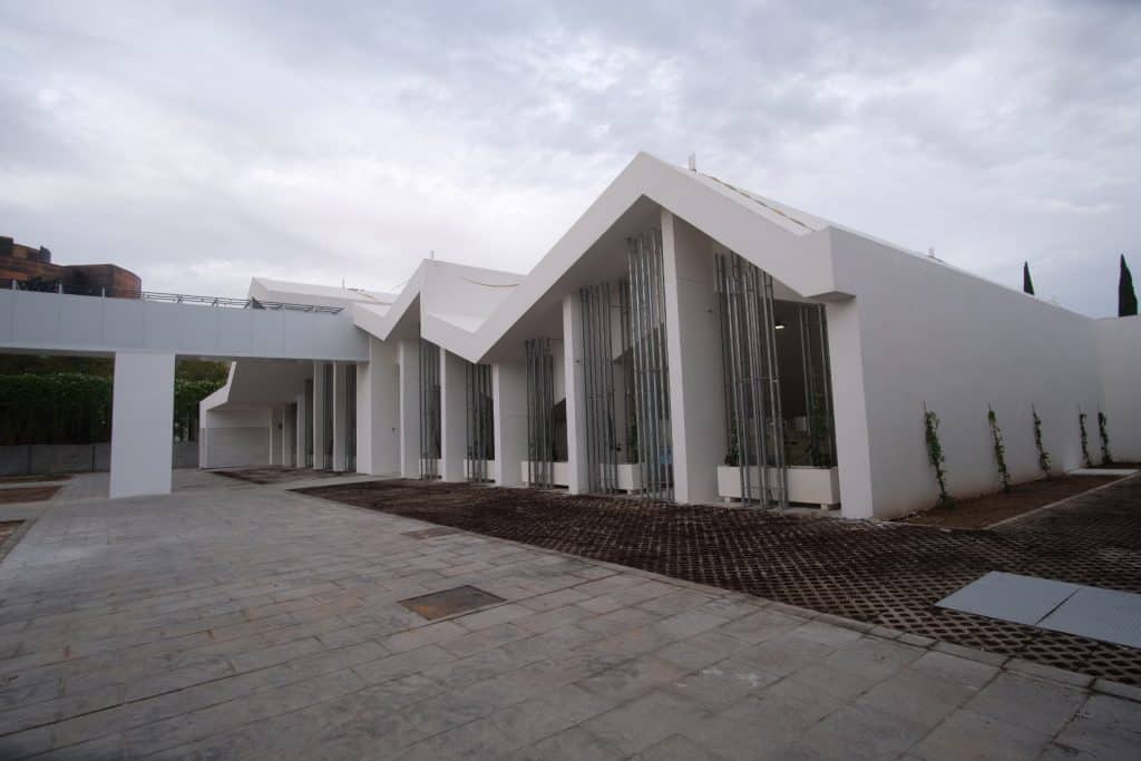 Todos estos elementos innovadores de control térmico se aplican en los tres grandes espacios que resultan de la intervención. En primer lugar, el anfiteatro, que fue utilizado durante la Expo 92 como quiosco de espectáculos. Tiene forma semicircular de aproximadamente 28 metros de diámetro y tiene capacidad para 200 personas. Se sitúa en depresión respecto al nivel de la avenida para minimizar la entrada de aire exterior. El confinamiento se completa con un muro diametral que cierra el escenario y los cipreses que rodean la zona de gradas.