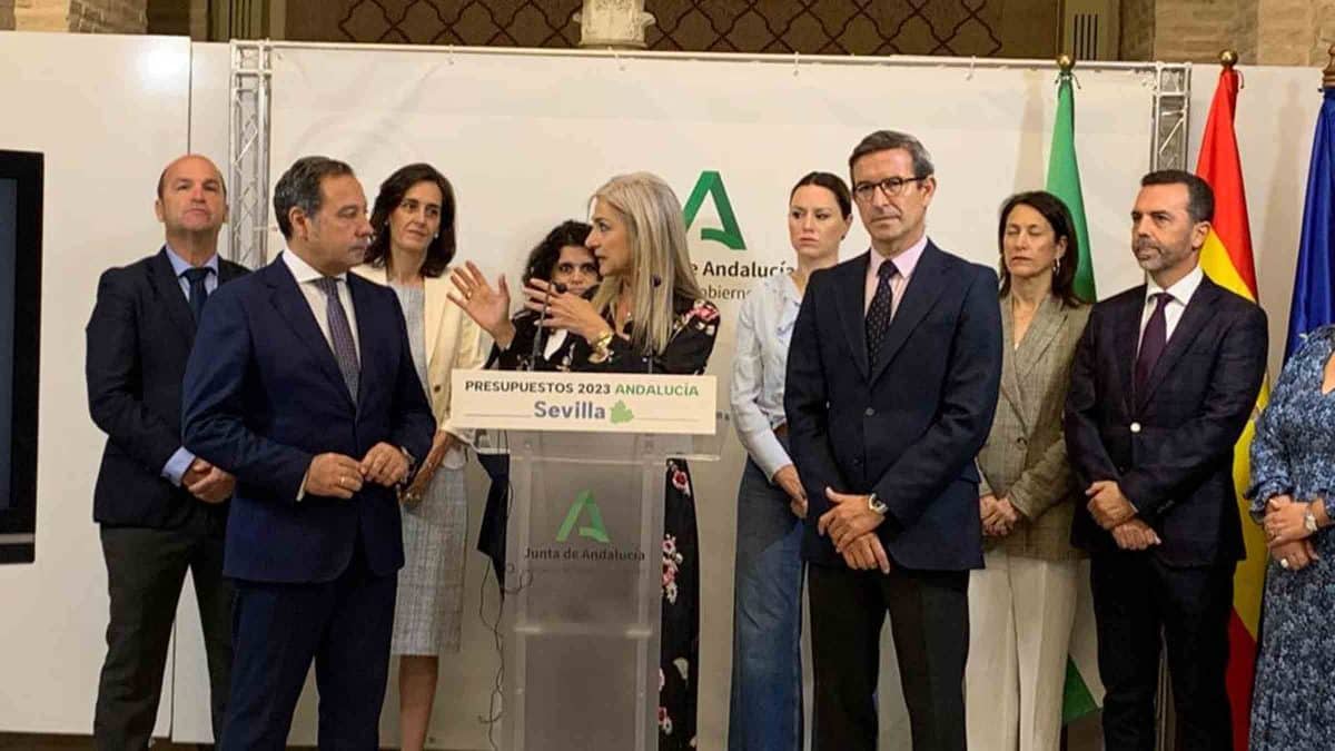 La consejera de Desarrollo Educativo y Formación Profesional, Patricia del Pozo, y el consejero de Política Industrial y Energía, Jorge Paradela, acompañados por el delegado del Gobierno de la Junta en Sevilla, Ricardo Sánchez, han presentado en rueda de prensa las partidas presupuestarias e inversiones para la provincia de Sevilla que contempla el proyecto de Presupuestos de Andalucía para 2023.
