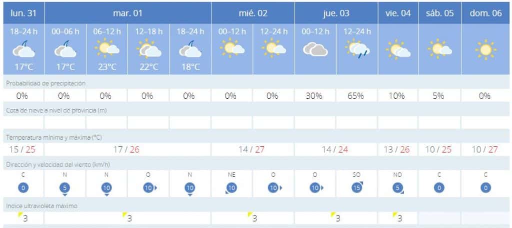 Según informa la Agencia Estatal de Meteorología (AEMET), de lunes a miércoles las mínimas oscilarán entre los 14 y los 17 grados, mientras las máximas alcanzarán los 27 este miércoles. Por si parte, el jueves día 3 de noviembre habrá hasta un 65% de probabilidades de precipitaciones durante la tarde. El resto de la semana se prevé seca.