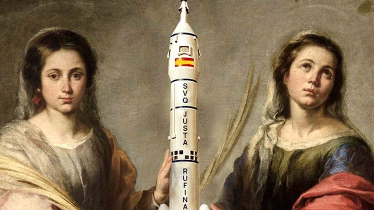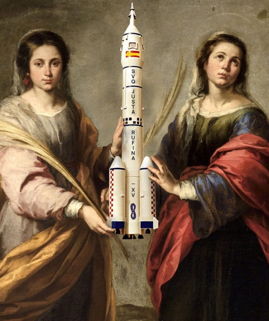 El ingenio de los creadores de estos memes no cesa y ha llegado hasta las obras de arte. En esta creación de autor desconocido, se puede ver el cuadro de Justa y Rufina que, en lugar de sujetar la Giralda, sostienen entre sus manos un cohete con la inscripción «SVQ. Justa. Rufina. XV» y el símbolo del NO-DO de Sevilla.