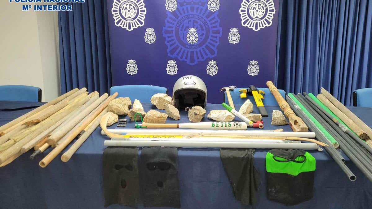 Los ultras del derbi sevillano allí concentrados, al observar la presencia policial, iniciaron su huida dejando atrás los objetos contundentes que portaban, por lo que los policías actuantes finalmente consiguieron intervenir más de 50 palos de grandes dimensiones, tres barras de hierro, tres palos de hockey, un casco, cuatro pasamontañas, una bengala, un martillo, un antirrobos y multitud de piedras de diferentes tamaños.