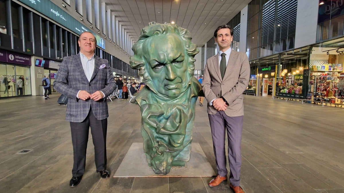 El delegado de Economía, Comercio y Turismo del Ayuntamiento de Sevilla, Fran Páez, y el subdirector de Estaciones Sur de Adif, Ángel García de la Bandera, han visitado este viernes la reproducción del «cabezón» de los premios Goya que se ha ubicado en el vestíbulo de recepción de la estación de Santa Justa. La exposición de esta gran escultura, que tiene dos metros de altura y pesa 200 kilos, tiene como objetivo promocionar entre los visitantes y viajeros la próxima gala de entrega de los Premios Goya 2023 que se celebra en Sevilla el 11 de febrero. Esta reproducción, realizada por artistas falleros valencianos, forma parte de la colección de ocho cabezones gigantes que se pueden ver en ubicaciones como Plaza San Francisco, Plaza de España, la Glorieta frente a Casino, Plaza del Altozano, FIBES, Nervión Plaza, la terraza Marqués de Contadero y en la Avenida de las Ciencias de Sevilla Este, que también permanecerán expuestos hasta el día 13.