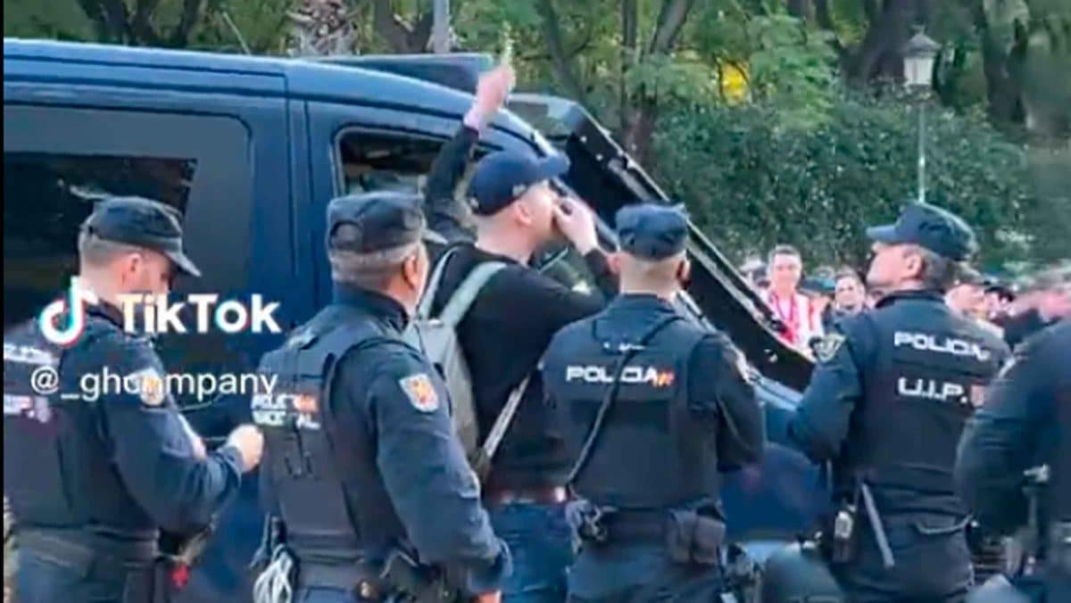 Durante la previa del Sevilla – PSV de este jueves, un hincha del equipo visitante comenzó a cantar al resto de aficionados con el micrófono del furgón de la Policía Nacional en Sevilla. Los agentes le dejaron usar el micrófono con el pretexto de calmar a los aficionados, pero una vez que el hincha se hizo con el dispositivo, comenzó a cantar cánticos.