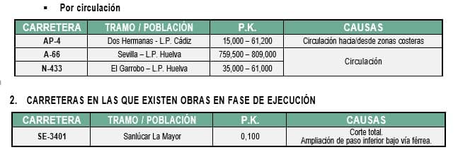 Las carreteras de Andalucía que previsiblemente soportarán el mayor número de desplazamientos son A-357, A-4, A-44, A-45, A-49, A-66, A-7, A-92, A-92M, AP-4, AP-7, MA-20, N-4 y la red secundaria para el acceso a zonas turísticas de descanso y las de segunda residencia.