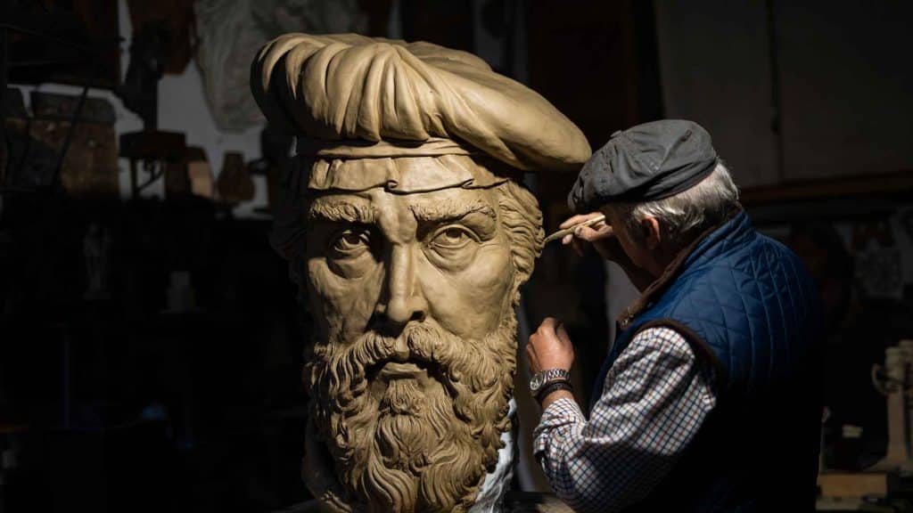 El proceso creativo de todo el conjunto se ha gestado en el taller de Paco Parra en el sevillano Pasaje Mallol. Allí, el escultor inició el diseño y posterior modelado del busto en arcilla sobre una estructura de acero. Una vez finalizada la escultura, se extrajeron moldes de la pieza con la técnica del vaciado, en esta parte del proceso el trabajo en barro se pierde. Posteriormente, comenzaron los trabajos de fundición sobre moldes capaces de soportar las altas temperaturas del broce fundido. Por último, se montaron las piezas y se aplicó una patina sobre el metal para darle su aspecto final.