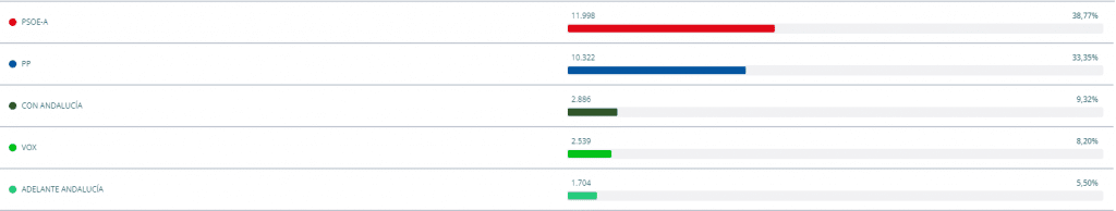 Le siguen los ganadores locales en esta votación, el PP (10.522), los izquierdistas de Con Andalucía (2886), Vox (2539) y Adelante Andalucía (1704).