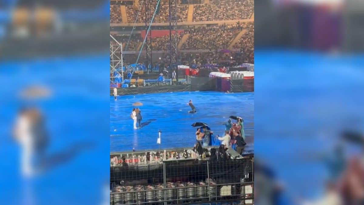 Manuel Carrasco actuó este viernes en el Estadio Olímpico de la Isla de la Cartuja y la lluvia empapó al público asistente en los minutos previos al concierto del artista onubense. Durante unos minutos, el Estadio Olímpico se convirtió en una auténtica piscina, y las redes se han llenado de vídeos de estos instantes.