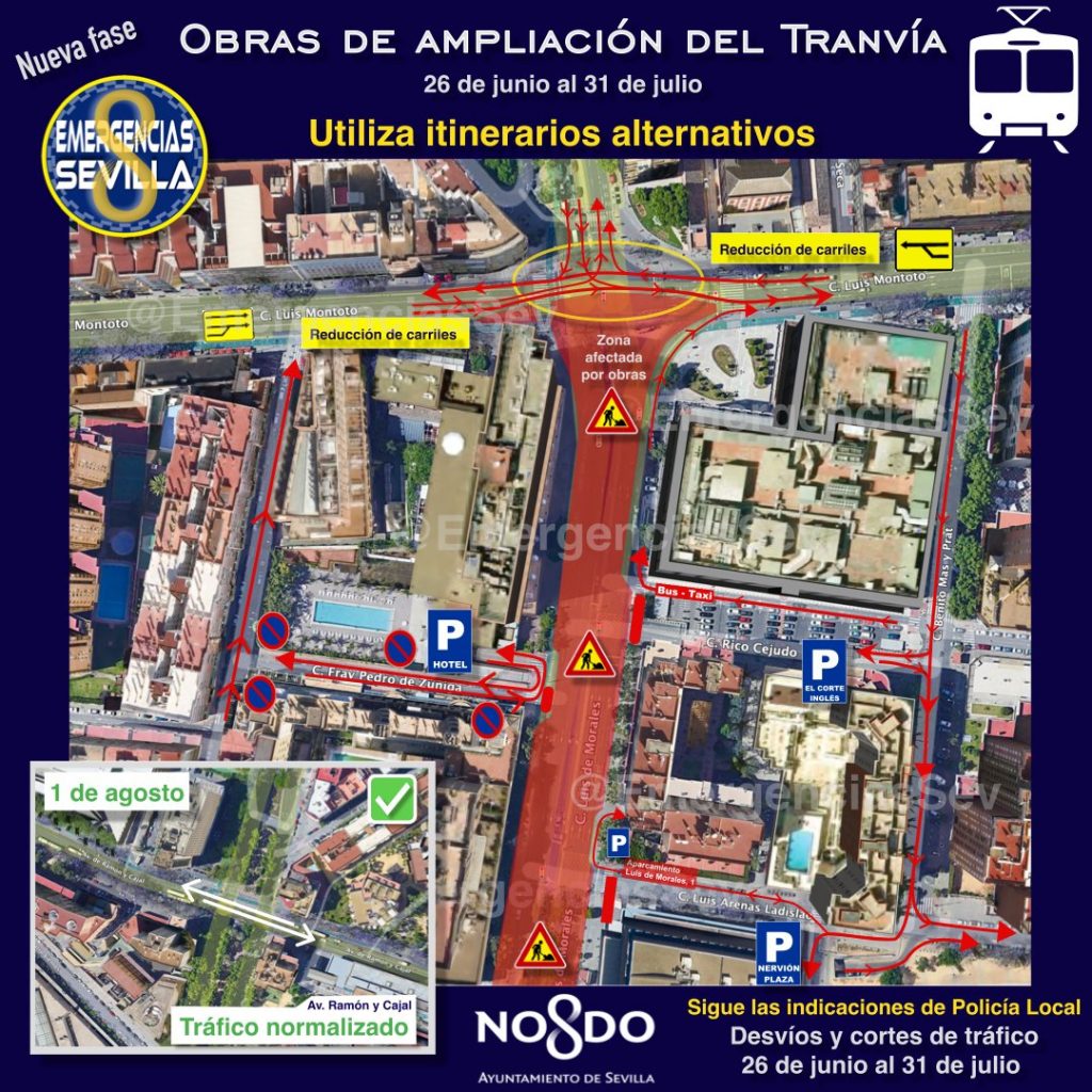 Con motivo de la continuación de las obras de ampliación del tranvía desde la parada de San Bernardo hasta Nervión, desde el lunes 26 de junio, los tramos de la avenida de Luis de Morales comprendidos entre las calles Luis Montoto y Fray Pedro de Zúñiga y entre las calles Luis Arenas Ladislao y Luis Montoto quedarán cerrados tráfico rodado, hasta el 31 de julio.