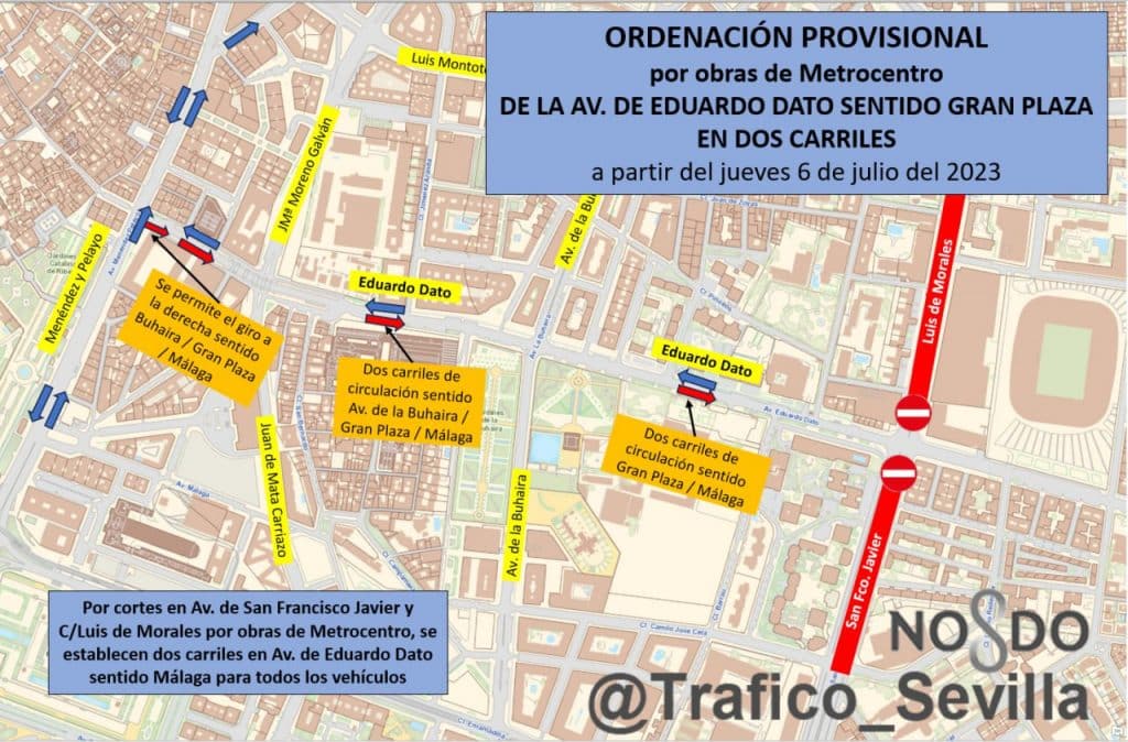 Desde este jueves 6 de julio, la avenida Eduardo Dato de Sevilla, en su tramo comprendido entre Menéndez Pelayo y Gran Plaza, será de doble sentido de circulación. Este cambio se debe a las obras del tranvía hasta Nervión, lo que permitirá, además, el giro a la derecha en Menéndez Pelayo hacia la Buhaira.