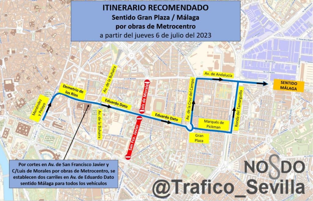 El tráfico de paso que habitualmente optaba por Kansas City para dirigirse a Luis de Morales deberá dirigirse por Éfeso, Avenida del Greco, Eduardo Dato y Ronda del Tamarguillo, en función de su destino. Los conductores procedentes de la Avenida de Kansas City en dirección hacia Luis de Morales girarán a la izquierda hacia Luis Montoto en dirección a la Avenida de Andalucía.