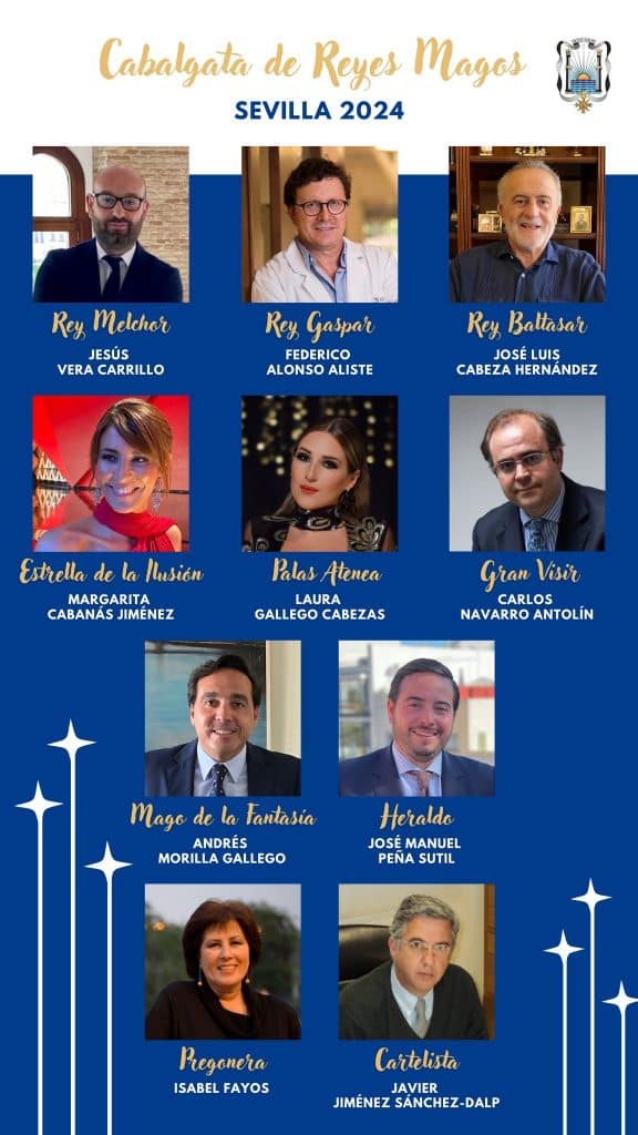 El Ateneo de Sevilla ha desvelado este lunes los nombres de las personalidades que protagonizarán la Cabalgata de los Reyes Magos en 2024. Jesús Vera Carrillo, presidente y fundador de la promotora inmobiliaria ABU; Federico Alonso Aliste, director Médico y CEO de Tecnolaser Clinic Vision; y José Luis Cabeza Hernández, empresario hostelero, fundador de Mesón Serranito, encarnarán a Melchor, Gaspar y Baltasar, respectivamente.
