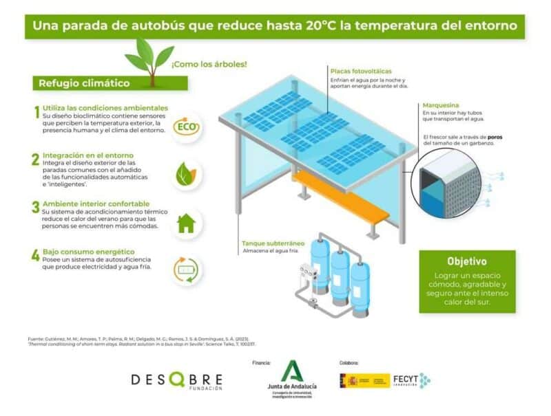 «No es como un aire acondicionado, que produce aire frío; sino que la propia estructura de la parada de autobús emite frescor, como ocurre con los frigoríficos», explica a la Fundación Descubre el investigador de la Universidad de Sevilla José Sánchez.