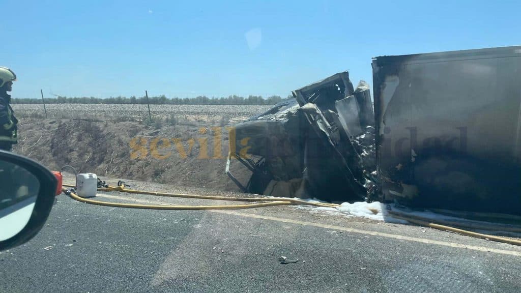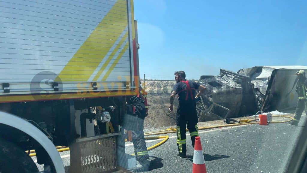 El incendio producido en un camión frigorífico en la vía A-92 ha provocado un atasco en el kilómetro 87 de la misma, a la altura de Torreblanca. Los Bomberos de Sevilla han acudido al lugar para extinguir el fuego, viéndose obligados a alterar la circulación en la zona.