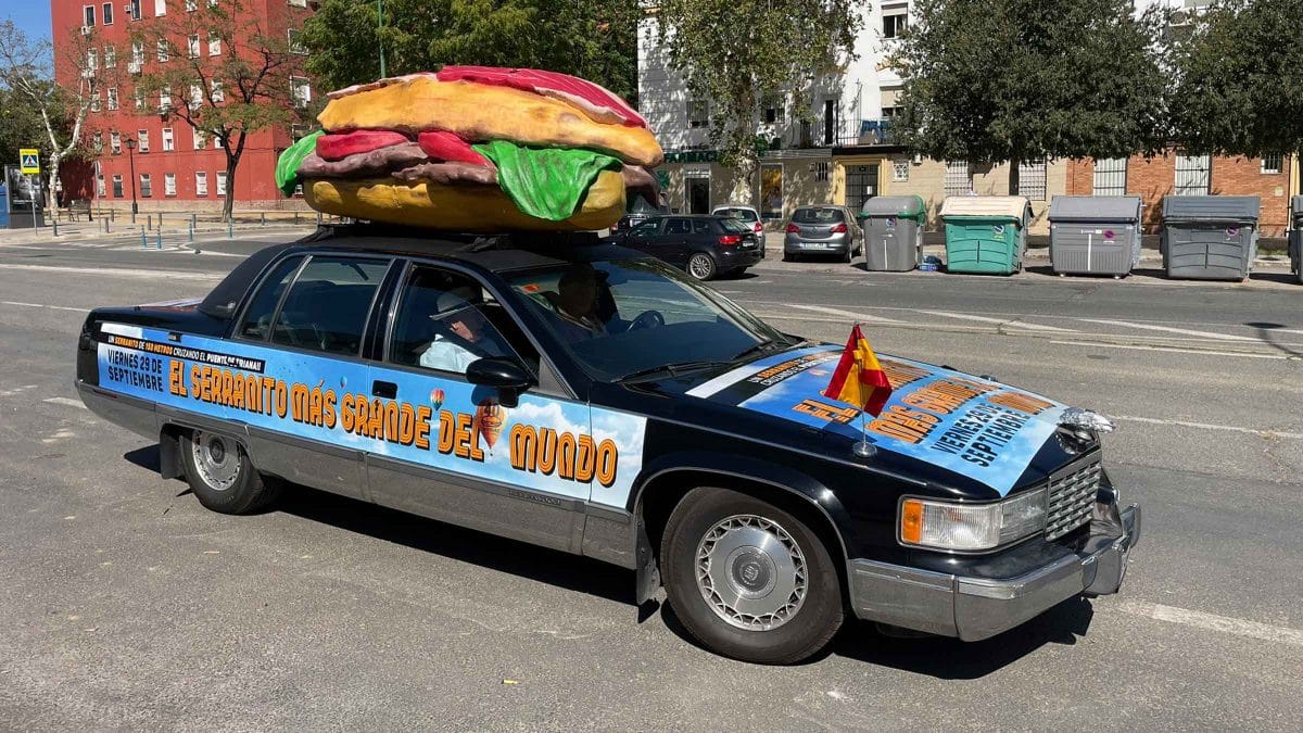 Ahora, la capital hispalense se encuentra calentando motores de cara al evento de este viernes. Por la ciudad se ha podido ver un automóvil con un serranito gigante en su techo y carteles en su capo y laterales anunciando el acontecimiento.