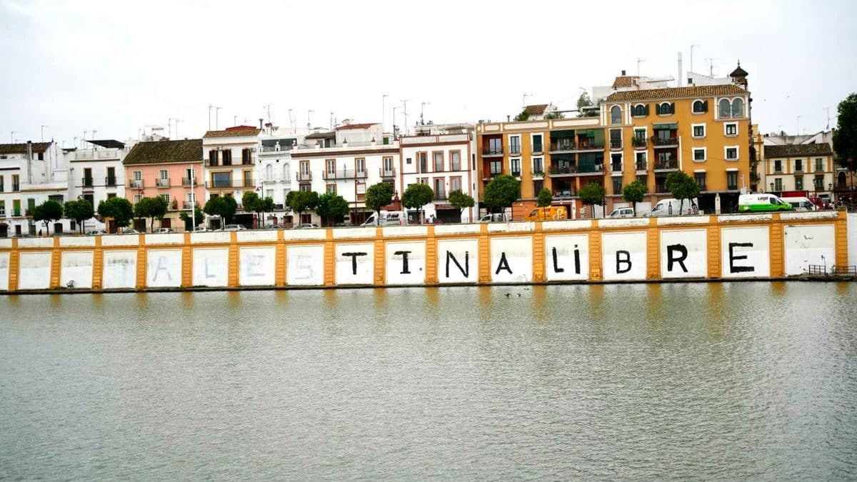Operarios de Lipasam están eliminando la enorme pintada con la que ha amanecido el muro de la calle Betis, al borde del río Guadalquivir, con un mensaje de apoyo al pueblo palestino.