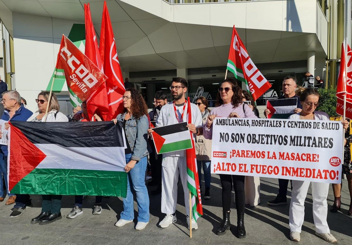 Una veintena de miembros del Sindicato Provincial de Sanidad y Sectores Sociosanitarios de CCOO y UGT han acudido a una concentración este miércoles a la puerta del hospital Macarena para exigir un alto el fuego «inminente» y «el fin del bloqueo» en la franja de Gaza. Los asistentes han reclamado que puedan entrar medicamentos y alimentos con los que abastecer a la población y a los profesionales sanitarios.