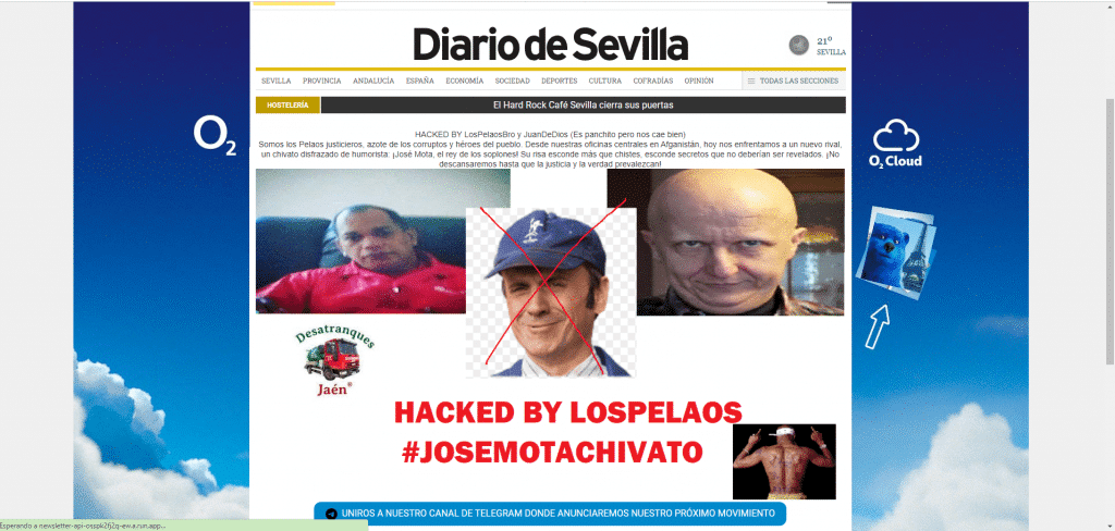 El Diario de Sevilla, una de las principales cabeceras locales de la capital andaluza, acaba de sufrir un hackeo. Desde hace una hora aproximadamente, al entrar en la página, la única información disponible consiste en imágenes de personajes como la del humorista José Mota y un texto que dice: «HACHED BY LosPelaosBro y JuanDeDIOS (Es panchito pero nos cae bien)»