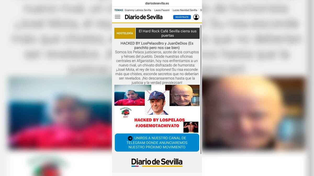 El Diario de Sevilla, una de las principales cabeceras locales de la capital andaluza, acaba de sufrir un hackeo. Desde hace una hora aproximadamente, al entrar en la página, la única información disponible consiste en imágenes de personajes como la del humorista José Mota y un texto que dice: «HACHED BY LosPelaosBro y JuanDeDIOS (Es panchito pero nos cae bien)»