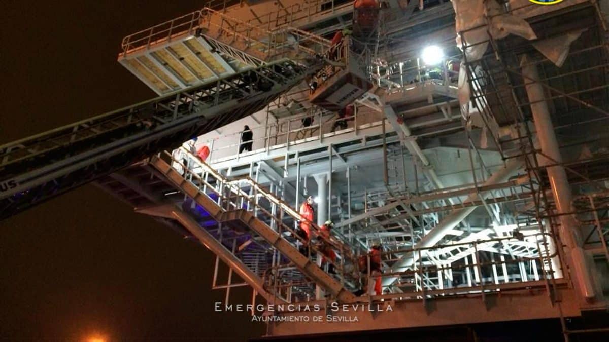 Un trabajador de 30 años ha sufrido un accidente laboral en la madrugada del martes tras caerse desde un andamio de 20 metros de altura. Efectivos de los Bomberos de Sevilla y el Grupo de Emergencias Sanitarias 061 han realizado con éxito una compleja maniobra para el rescate.