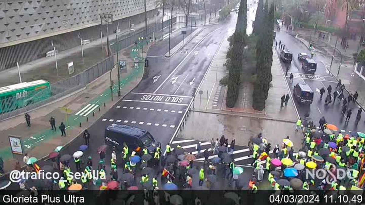 La avenida de la Palmera de Sevilla está bloqueada para el tráfico en las inmediaciones del campo del Betis debido a la manifestación de agricultores desde las 11:30 de esta mañana. En esta ocasión, no han traído sus tractores, sino que avanzan a pie, muchos de ellos luciendo chalecos reflectantes amarillos.