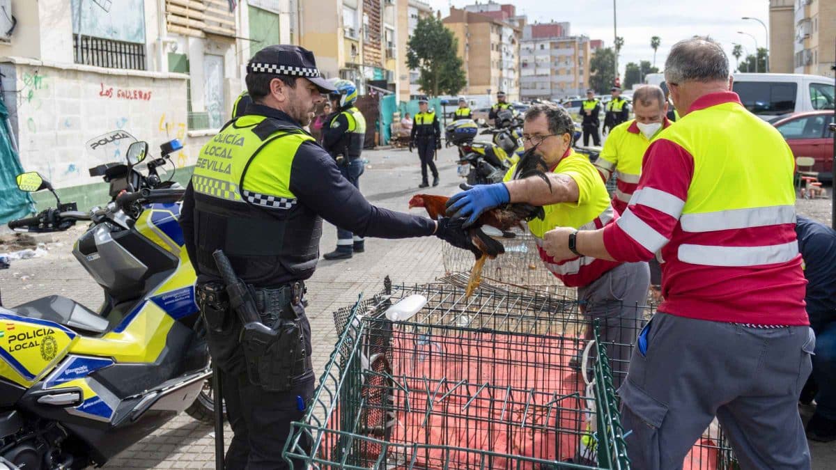 La Policía Local de Sevilla ha detectado y desmantelado una explotación de gallos de pelea en el Polígono Sur gracias a la colaboración ciudadana. Los agentes desplegaron este miércoles un amplio operativo que se ha saldado con tres personas denunciadas por tener en la vía pública una explotación ganadera sin registrar y sin cumplir las condiciones higiénico-sanitarias.