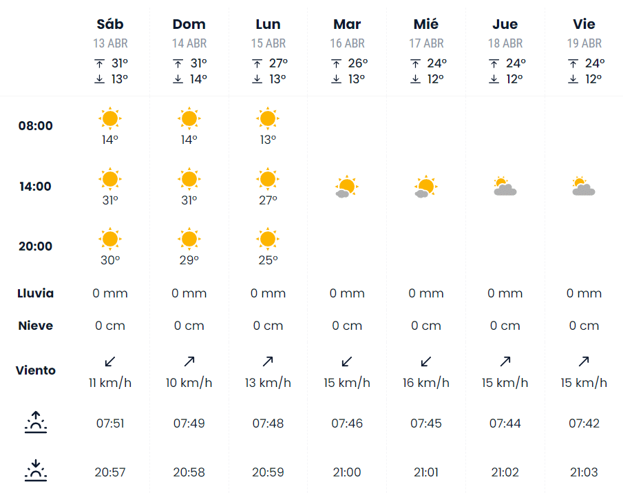 El sábado 13 de abril, día de la cena del Pescaíto, no se esperan precipitaciones y, además, será un día completamente soleado. Los termómetros oscilarán entre los 14 grados de mínima y los 31 de máxima. La tónica será muy similar para los días 14 y 15 de abril, domingo y lunes respectivamente.