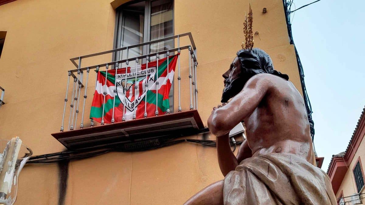 Los balcones estaban adornados con banderas del equipo vasco, creando escenas llamativas como la del Cristo mientras recorría la calle Santísimo Cristo de las Tres Caídas, momento compartido por la hermandad en sus redes sociales.