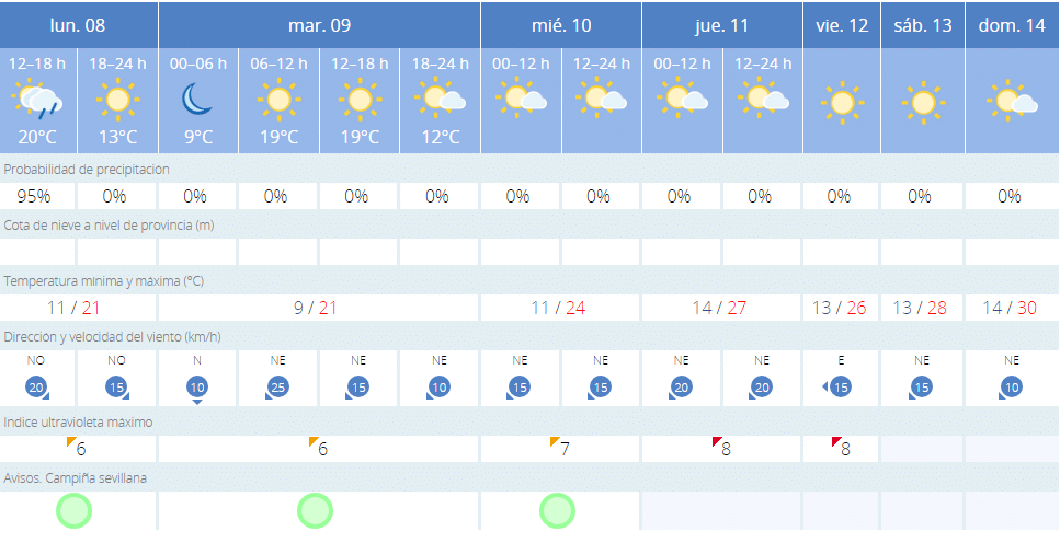 El chaparrón de este lunes no es indicativo del tiempo que habrá durante la Feria de Abril. Pasa su comienzo, la Aemet pronostica temperaturas que rozarán los 30 grados centígrados, cielos completamente despejados y probabilidades de precipitaciones nulas.