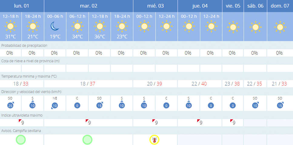 Ya el sábado, se prevé la entrada en la región de viento del norte, causando una bajada leve de las temperaturas, con un descenso de cinco grados en las máximas en Sevilla hasta el domingo. Además, la AEMET ha lanzado un aviso amarillo por altas temperaturas para el próximo miércoles.
