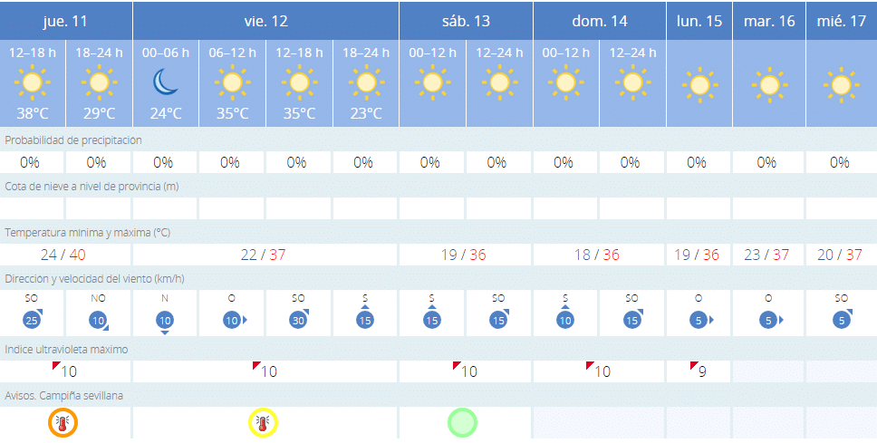 La primera ola de calor del verano se acerca a Sevilla y viene para quedarse. La capital tendrá temperaturas de más de 40 grados hasta, al menos, la próxima semana, según las predicciones de eltiempo.es. Asimismo, la Agencia Estatal de Meteorología (Aemet) ha activado para este jueves un aviso naranja por altas temperaturas en toda la campiña sevillana, y otro amarillo en la Sierra Norte.