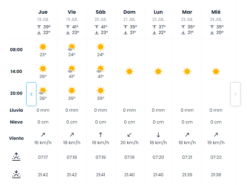 De cara al fin de semana, y según eltiempo.es, las máximas oscilarán entre los 34 y los 37 grados, siendo la antesala de una semana (del 15 al 21 de julio) en la que se superará la barrera de los 40ºC.