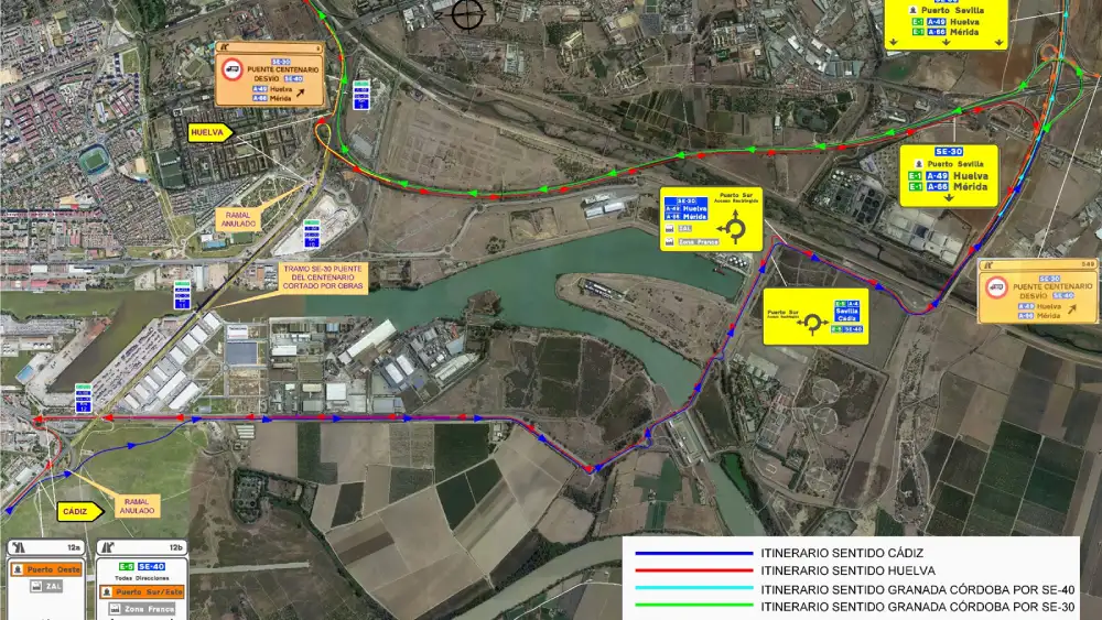 El tráfico procedente de la SE-30 en sentido descendente de kilómetros se desviará en la salida 12b (E-5/SE-40/todas direcciones, puerto sur/este/zona franca), hacia la carretera de la esclusa (SE-31), continuando por la misma hasta el enlace con la SE-40, donde se podrá acceder a todas direcciones incluyendo la opción de continuar por la SE-30.