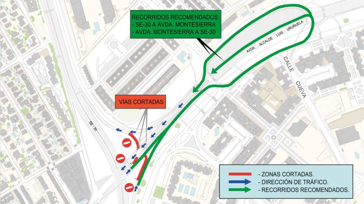 Desde el 8 de octubre hasta el 11 de noviembre, se realizarán trabajos en el acceso a Sevilla Este, en dirección decreciente de la SE-30, como parte de la construcción de una segunda rotonda, que es un componente clave del proyecto del tranvibús que conectará esta zona con la Estación de Santa Justa.