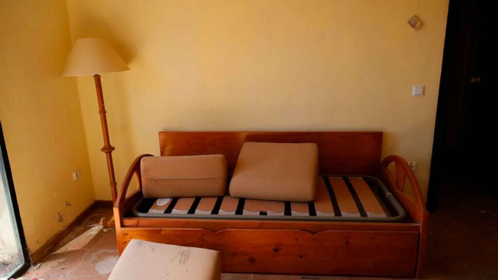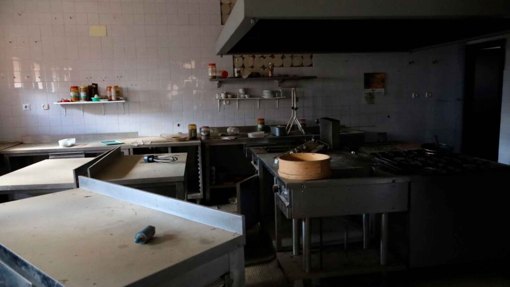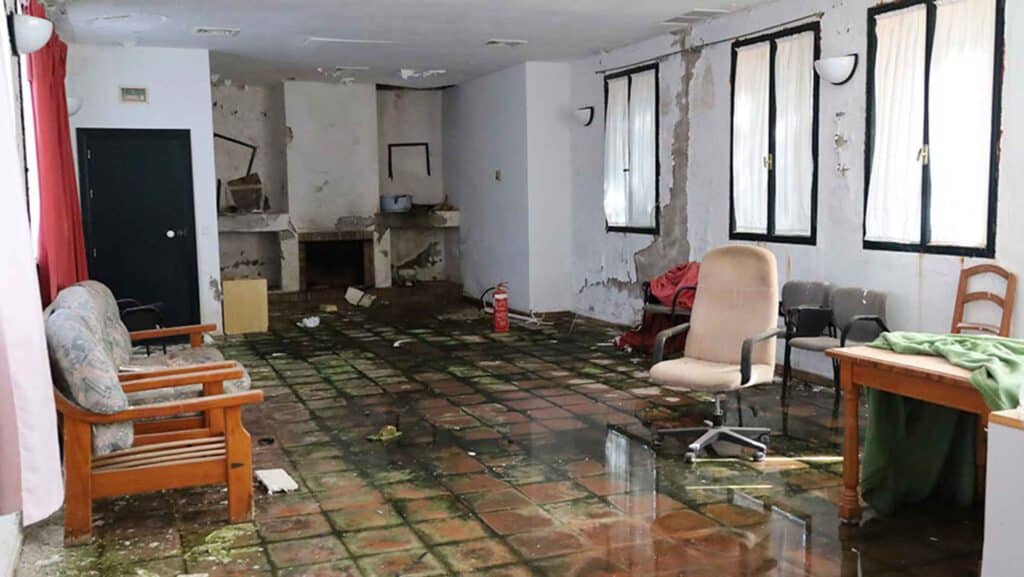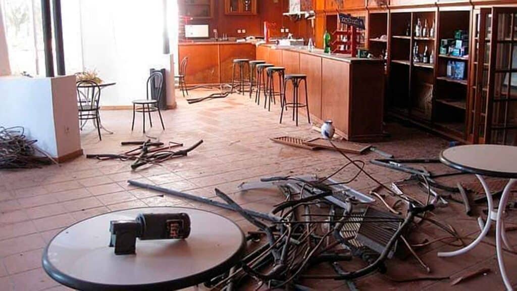 Parte del mobiliario se amontona en algunos espacios comunes. Mesas, sillas, cajoneras, estanterías… De las paredes y los techos cuelgan luminarias, muchas de ellas rotas. El menaje de cocina permanece en las repisas, dispuesto para ser utilizado, junto a algunas botellas que aún continúan llenas. En algunas de las villas, las colchas siguen dispuestas sobre las camas, y los electrodomésticos (televisores, frigoríficos…) están en su sitio, pero vacíos por dentro, después de que alguien haya extraído motores, cables y cualquier parte vendible.