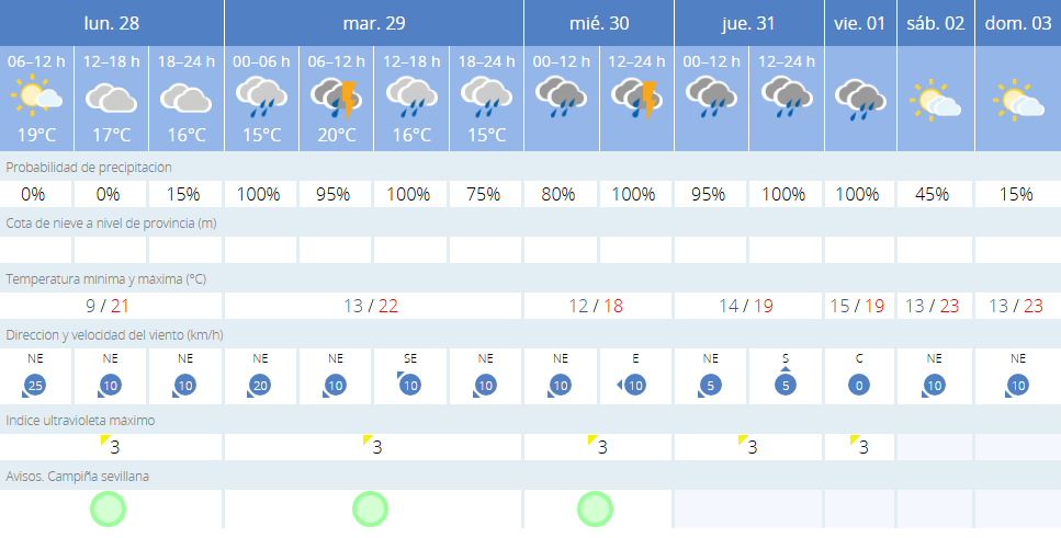 La Virgen de la Estrella ya se encuentra en San Jacinto, después del traslado de su capilla hasta la parroquia este pasado viernes, preparada para la procesión extraordinaria a la Catedral de Sevilla con motivo del 25 aniversario de la coronación canónica de la Virgen. Sin embargo, la jornada del jueves, 31 de octubre, día del primer traslado a la Seo hispalense, se prevé de lluvia. Según la información de la Agencia Estatal de Meteorología (AEMET), habrá un 100% de probabilidad de lluvia, lo que podría obligar a aplazar dicho traslado.