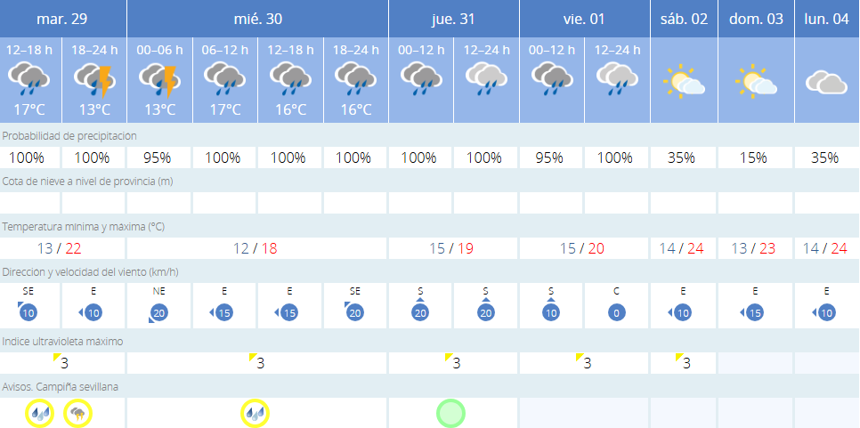 Una previsión que se extiende hasta este miércoles, donde también hay aviso amarillo por fuertes lluvias en toda la provincia. En este caso, el aviso estará vigente desde las 14:00 hasta las 19:00 horas, y quedará fuera la Sierra Norte de la provincia. Ya a partir del jueves el pronóstico, aunque con lluvias, dejará atrás los avisos.