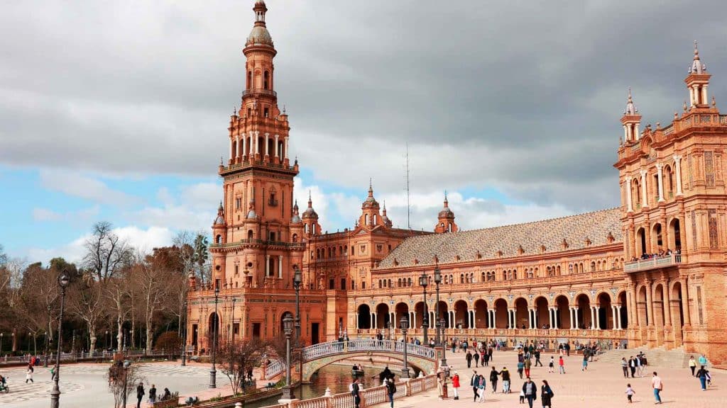 La impresionante Plaza de España, construida en 1929 para la Exposición Iberoamericana, ha servido de escenario en películas de Hollywood como Star Wars: Episodio II y Lawrence de Arabia. Su arquitectura semicircular, con sus azulejos y puentes, la convierten en uno de los lugares más fotografiados de la ciudad.