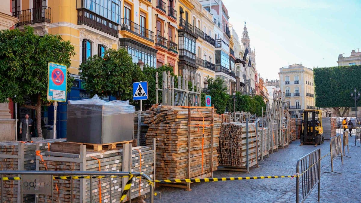 Palcos descargados en la Plaza de San Francisco. A 21 de febrero de 2024, en Sevilla.